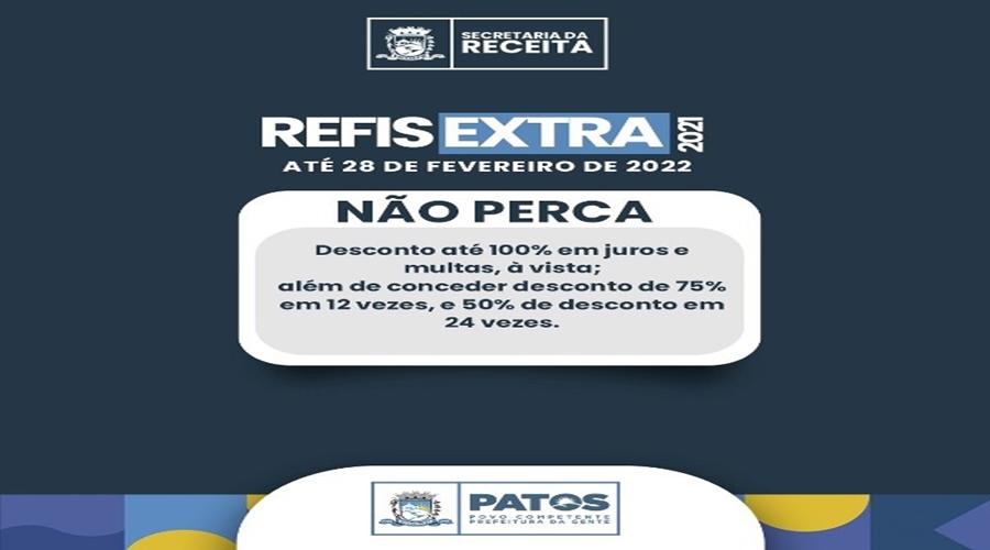 A Prefeitura de Patos, por meio da Secretaria da Receita, informa que está em vigência a campanha do REFIS Extra 2021, com prazo até 28 de fevereiro de 2022.
