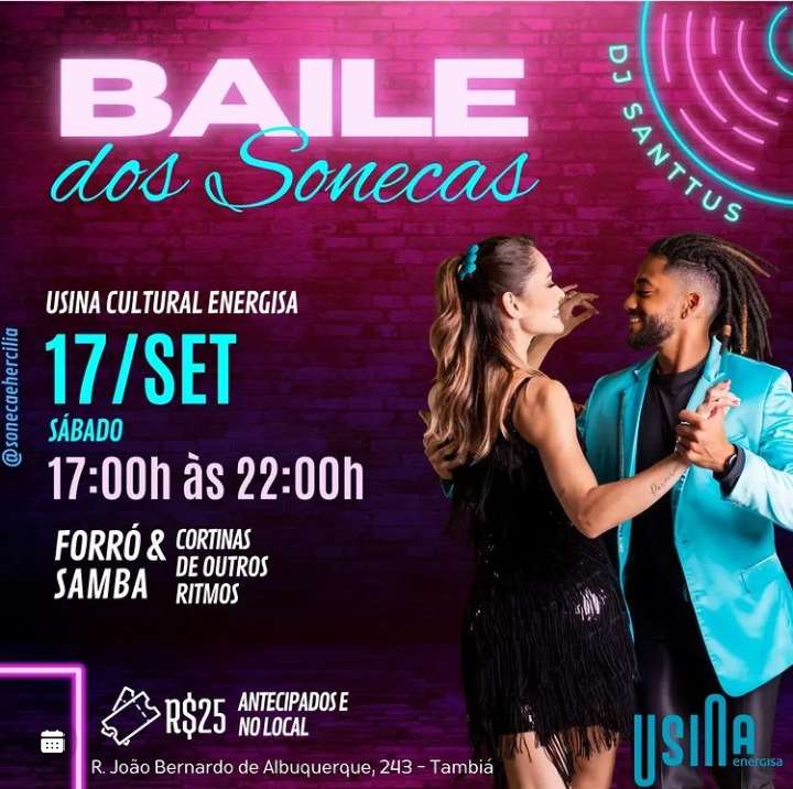 No sábado (17), A Usina Energisa recebe o 2° Baile dos Sonecas do ano na sala Vladimir Carvalho, com muito forró e samba (cortinas de outros ritmos). E quem vai comandar o som, será o DJ Santos. Os ingressos são vendidos pelo link: forms.gle/rMD6imfqYbd6bhHv, e na bilheteria no valor de R$ 25,00.