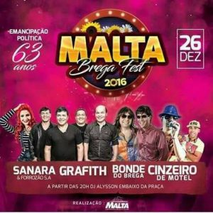 Na segunda-feira, dia 26 de dezembro, a cidade de Malta estará aniversariando: 63 anos de emancipação política e a prefeitura, para marcar a data, vai realizar em praça pública, o Malta Brega Fest 2016, com a presença das seguintes atrações: Sanara e Forrozão SA, Graffith, Bonde do Brega, Cinzeiro de Motel. Às 20 horas o som já começa a rolar com o DJ Alysson.