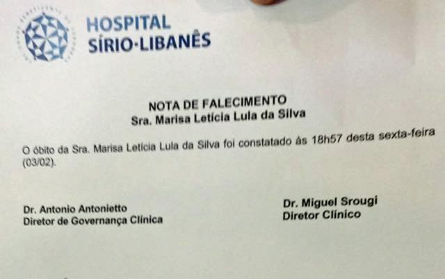 A ex-primeira-dama Marisa Letícia Lula da Silva morreu nesta sexta-feira (3) no Hospital Sírio-Libanês, em São Paulo. A mulher do ex-presidente Lula tinha 66 anos. Dona Marisa estava internada desde o dia 24 de janeiro, depois de ter sofrido um acidente vascular cerebral hemorrágico provocado pelo rompimento de um aneurisma.