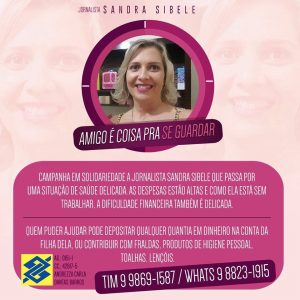 Sandra está hospedada na casa do cabeleireiro Roberto Lords, em João Pessoa e além do sofrimento com a doença, a situação financeira também é delicada, já que ela precisa tomar 13 tipos de medicamentos por dia, além das despesas com alimentação, fraldas, produtos de higiene pessoal, entre outros.