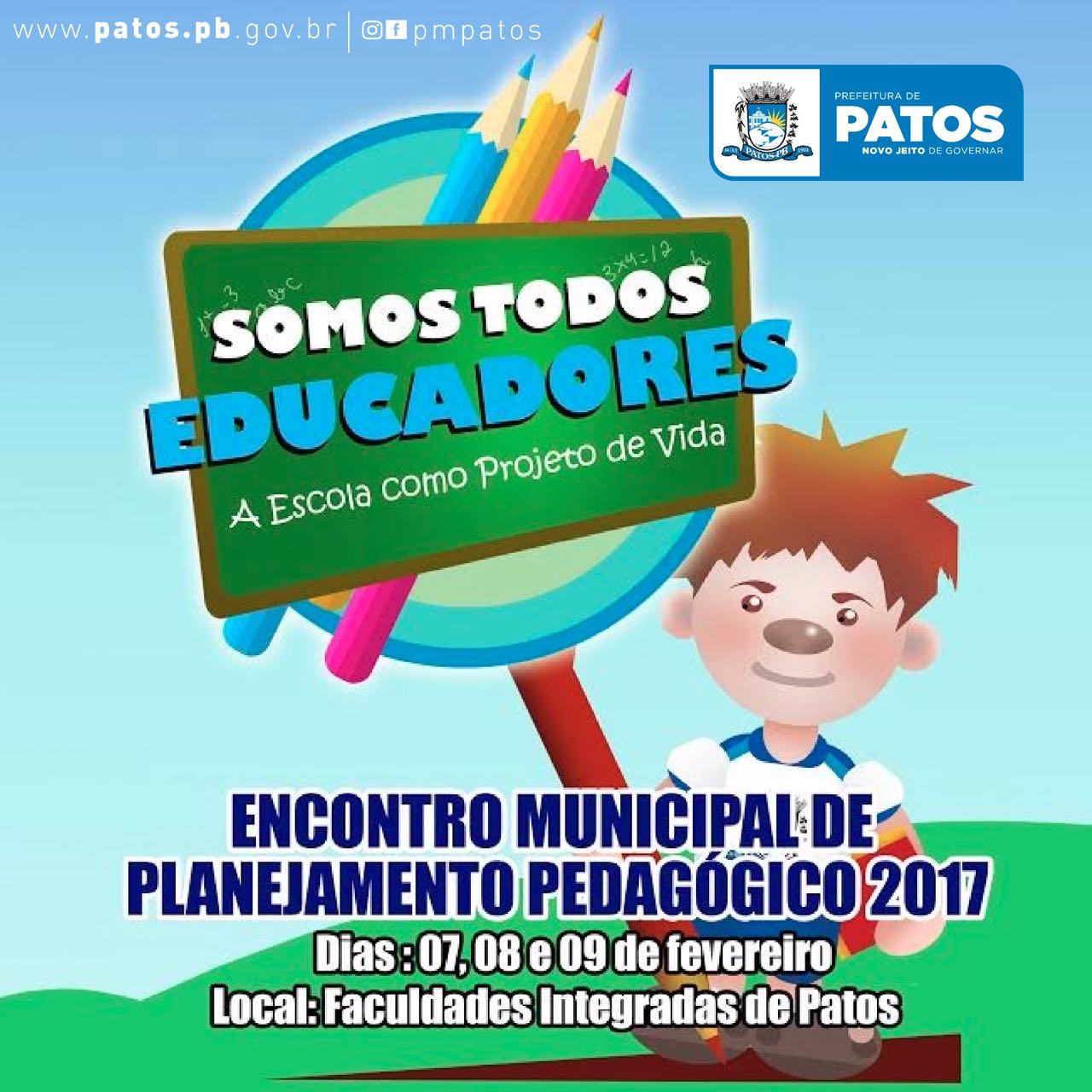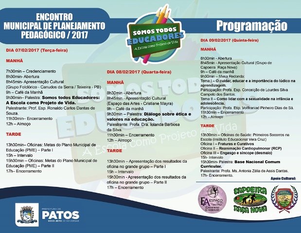 Com o tema “Somos todos Educadores: A Escola como Projeto de Vida”, a Secretaria Municipal de Educação estará realizando, de hoje até a quinta-feira, no ginásio das Faculdades Integradas de Patos – FIP, o Encontro Municipal de Planejamento Pedagógico, visando o início do ano letivo 2017.