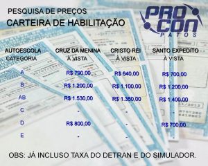 Em pesquisa realizada pelo PROCON Municipal de Patos, na última sexta-feira, dia 03 de fevereiro, o órgão de defesa do consumidor pesquisou os preços correspondentes à Carteira Nacional de Habilitação (CNH). Foram pesquisadas três autoescolas na cidade de Patos e os valores da pesquisa já trazem inclusas a taxa do DETRAN e a taxa do uso de simulador.