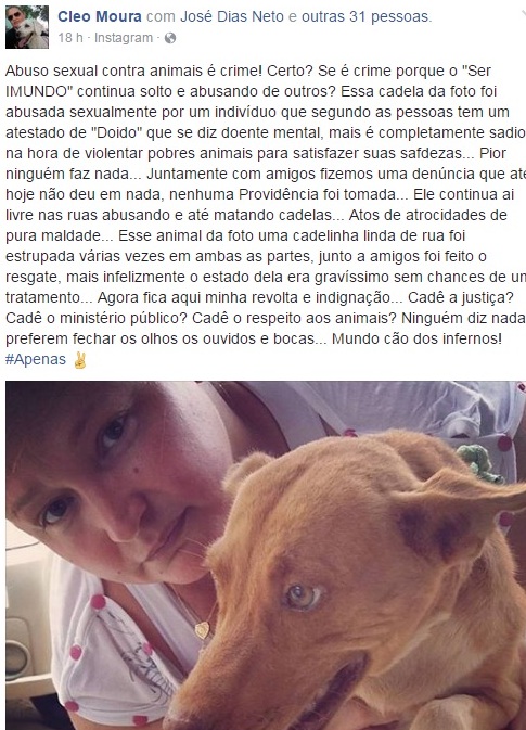 Cleo Moura revelou que o suposto abusador sofre de problemas mentais, e vem abusando de cadelas constantemente e até matando os animais.