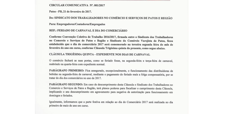 O Sindicato dos Trabalhadores no Comércio e Serviços de Patos e Região (Sintracs) informou que nesta segunda-feira de Carnaval, 27, será comemorado o Dia do Comerciário, e ficou acertado com o comércio que na terça-feira, 28, os estabelecimentos também serão fechados. Só quem pode abrir são as distribuidoras de bebidas.