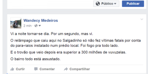 O jornalista Wandecy Medeiros, editor do site Folha Patoense, e que mora no Salgadinho, postou o seguinte na sua conta pessoal no Facebook: “Vi a noite tornar-se dia. Por um segundo, mas vi. O relâmpago que caiu aqui no Salgadinho só não fez vítimas fatais por conta do para-raios instalado num prédio local. Foi fogo pra todo lado. E o trovão que veio depois era superior a 300 milhões de vuvuzelas. O bairro todo está assustado!.