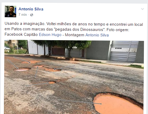 Enquanto os serviços não são realizados as cobranças continuam acontecendo. O humor também é uma forma de cobrar e, na tarde de hoje, o radialista Antônio Silva, que mora lá nas proximidades, e passa naquele local diariamente, disse que descobriu que “os buracos são pegadas de dinossauros”. “Voltei milhões de anos no tempo e encontrei um local em Patos com marcas das pegadas dos dinossauros”, disse Antônio Silva. “A pista está um horror e nos dias de chuva fica ainda pior”, explicou.