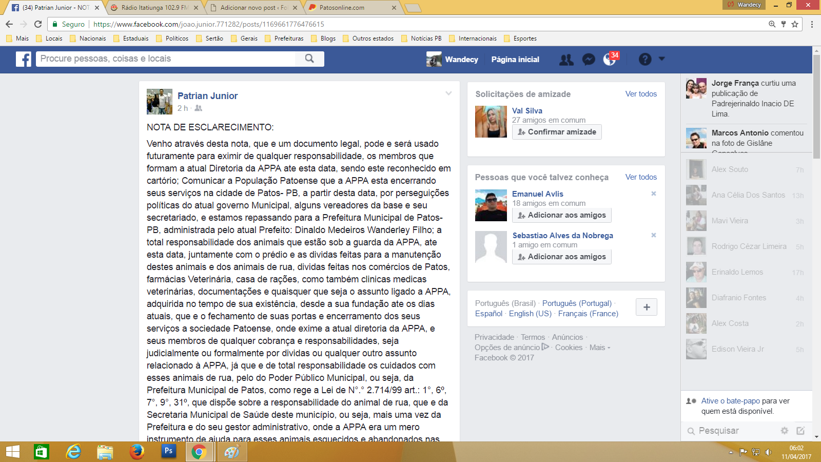 Venho através desta nota, que e um documento legal, pode e será usado futuramente para eximir de qualquer responsabilidade, os membros que formam a atual Diretoria da APPA ate esta data, sendo este reconhecido em cartório; Comunicar a População Patoense que a APPA esta encerrando seus serviços na cidade de Patos- PB, a partir desta data, por perseguições políticas do atual governo Municipal, alguns vereadores da base e seu secretariado, e estamos repassando para a Prefeitura Municipal de Patos- PB, administrada pelo atual Prefeito: Dinaldo Medeiros Wanderley Filho; a total responsabilidade dos animais que estão sob a guarda da APPA, ate esta data, juntamente com o prédio e as dividas feitas para a manutenção destes animais e dos animais de rua, dividas feitas nos comércios de Patos, farmácias Veterinária, casa de rações, como também clinicas medicas veterinárias, documentações e quaisquer que seja o assunto ligado a APPA, adquirida no tempo de sua existência, desde a sua fundação ate os dias atuais, que e o fechamento de suas portas e encerramento dos seus serviços a sociedade Patoense, onde exime a atual diretoria da APPA, e seus membros de qualquer cobrança e responsabilidades, seja judicialmente ou formalmente por dividas ou qualquer outro assunto relacionado à APPA, já que e de total responsabilidade os cuidados com esses animais de rua, pelo do Poder Público Municipal, ou seja, da Prefeitura Municipal de Patos, como rege a Lei de N°.° 2.714/99 art.: 1°, 6º, 7°, 9°, 31º, que dispõe sobre a responsabilidade do animal de rua, que e da Secretaria Municipal de Saúde deste município, ou seja, mais uma vez da Prefeitura e do seu gestor administrativo, onde a APPA era um mero instrumento de ajuda para esses animais esquecidos e abandonados nas ruas desta cidade, sobrevivendo da subvenção e doações dos seus voluntários e amantes dos animais, vindo a não receber mais a subvenção, APPA não tem como sobreviver e fecha suas portas, após nove anos de serviços Prestados para Cidade de Patos e para os animais de rua, os quais sofrem maus tratos indiretamente e diretamente pelo poder público municipal, no caso o GESTOR administrativo, já que o mesmo não cumpre com suas obrigações que são as leis municipais e federais.