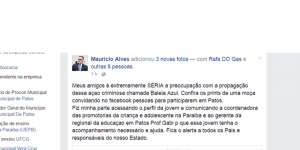 “Meus amigos é extremamente SÉRIA a preocupação com a propagação dessa açao criminosa chamada Baleia Azul. Confira os prints de uma moça convidando no facebook pessoas para participarem em Patos.