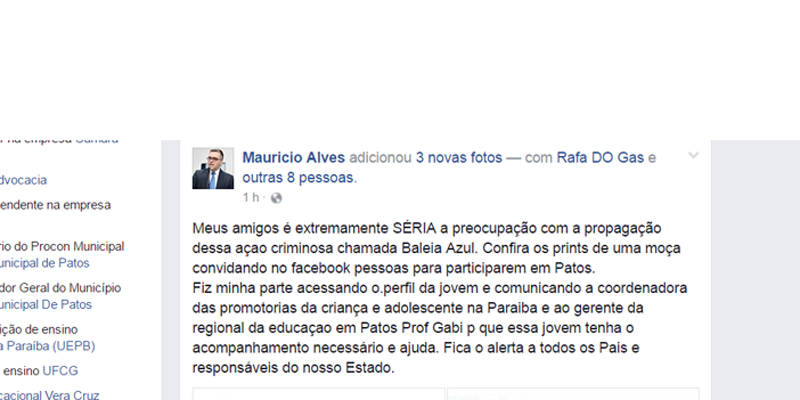 O advogado Maurício Alves denunciou e publicou nas redes sociais que uma jovem estudante da Escola Monsenhor Manuel Vieira, em Patos, está utilizando a rede social Facebook, para convidar jovens a participarem do jogo mortal conhecido como Baleia Azul, um tipo de jogo em que o participante vai vencendo etapas, passando por pequenos desafios, até culminar no desafio final: tirar a própria vida. Para “vencer” as etapas e se consolidar como “campeão” o participante tem de morrer.