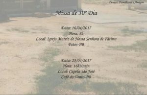 Amanhã, domingo, dia 16/04, acontece, às 8 horas, a missa de 30° dia de falecimento do senhor Fabiano Xavier da Nóbrega, na Igreja Matriz de Nossa Senhora de Fátima, em Patos.