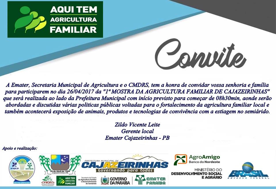 Acontece amanhã (quarta-feira, 26/04) a I Mostra de Agricultura Familiar de Cajazeirinhas, que será realizada ao lado da Prefeitura, com início previsto para 8:30 minutos, onde serão discutidas várias políticas públicas voltadas para o fortalecimento da agricultura familiar local e também acontecerá exposição de animais, produtos e tecnologias de convivência com a estiagem no semiárido.