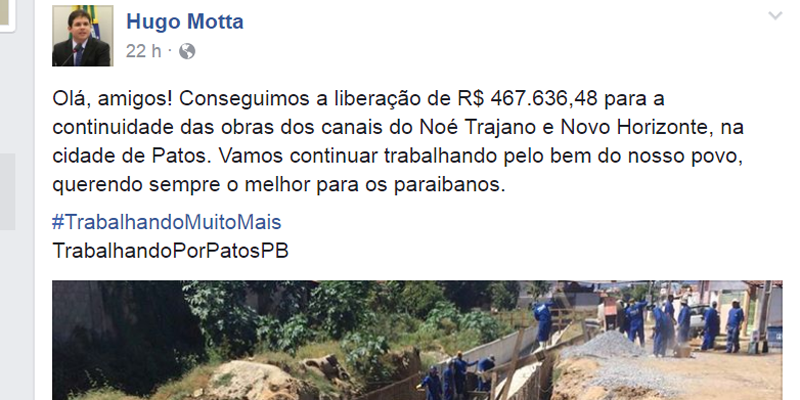 Início Locais Hugo Motta consegue recursos para continuidade das obras dos canais do Noé... Hugo Motta consegue recursos para continuidade das obras dos canais do Noé Trajano e Novo Horizonte 02/05/2017 ... 09:23h FacebookWhatsAppPrintCopy URL Através de suas redes sócias o deputado Hugo Motta (PMDB) anunciou a liberação de R$ 467.636,48 para a continuidade das obras dos canais do Noé Trajano e Novo Horizonte, na cidade de Patos. politicaparaquemgosta.com.br Deixe seu comentário LEIA MAISÚltimas notícias Locais Prestação de contas: recursos próprios e emendas ampliam qualidade da saúde pública em Patos Locais Saúde apresenta 2º RQDA de 2025 durante audiência pública na Câmara de Patos Locais Popular sofre tentativa de homicídio em Brejo do Cruz