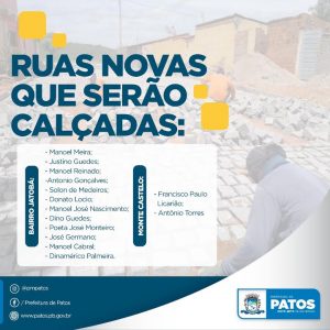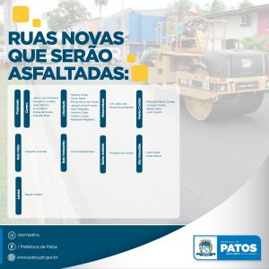 Com o objetivo de tornar a cidade de Patos cada vez mais estruturada, com acessibilidade e em pleno desenvolvimento e dando continuidade aos trabalhos que vêm sendo desenvolvidos pela Prefeitura de Patos, através da Secretaria Municipal de Infraestrutura, entram para sua segunda etapa a construção de asfaltos e calçamentos nos bairros e ruas do município.