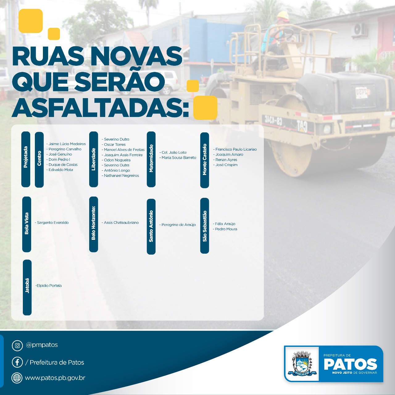 Também estão projetados serviços de calçamento e/ou pavimentação asfáltica nas ruas Jaime Lúcio Medeiros, Peregrino de Carvalho, José Genuíno, Pedro II, Duque de Caxias e Edvaldo Motta, no Centro; Sargento Everaldo, na Bela Vista; Elpídio Portela, no Jatobá; Severino Dutra, Oscar Torres, Manoel Alves de Freitas, Joaquim de Assis Ferreira, Odon Nogueira, Antônio Longo e Nathanael Negreiros, no bairro da Liberdade; Assis Chateaubriand, no Belo Horizonte; Coronel João Leite e Maria de Sousa Barreto, no bairro da Maternidade; Peregrino de Araújo, no Santo Antônio; Francisco Paulo Licarião, Joaquim Amaro, Renan Ayres e José Crispim, no Monte Castelo; Félix Araújo e Pedro Moura, no São Sebastião.