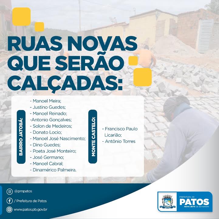 Autorizado o início dos serviços de calçamento nas ruas Manoel Meira, Justino Guedes, Manoel Reinaldo, Antônio Gonçalves, Solon de Medeiros, Donato Lócio, Manoel José do Nascimento, Dino Guedes, Poeta Manoel Monteiro, José Germano, Manoel Cabral e Dinamérico Palmeira, no bairro do Jatobá; Francisco Paulo Licarião e Antônio Torres de Morais, no Monte Castelo. Todas as ruas da zona Sul da Cidade.