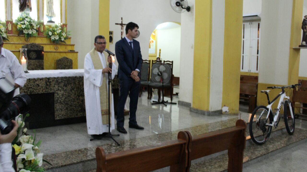 O padre, Nicodemos que celebrou a missa de cerimônia riu bastante com a atitude irreverente do noivo. Essa é a primeira vez que um noivo vai à igreja de São José de Piranhas de bicicleta.