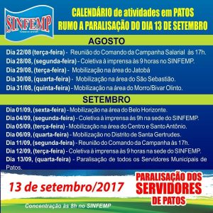 Os servidores públicos municipais de Patos estarão paralisando suas atividades no dia 13 de setembro. Será a terceira paralisação no município em decorrência do não atendimento das reivindicações apresentadas pela entidade ao gestor municipal. “Nós estamos na luta pela revisão salarial, retroativo a 1° de janeiro de 2017, até porque há três anos às gratificações dos servidores que têm, na cabeça do contracheque, o salário mínimo como base, estão congeladas; como também os demais servidores que ganham acima do salário mínimo estão com os salários e as gratificações congeladas há três anos. São esses os pontos principais da nossa reivindicação, pois não tem sentido o gestor dizer que não pode conceder a revisão salarial e ao mesmo tempo a gente vê a Prefeitura inchada de contratados e comissionados, superando hoje mais de 1.600 pessoas”, disse o sindicalista José Gonçalves, vice-presidente do Sinfemp.