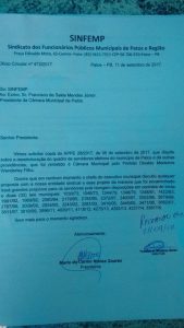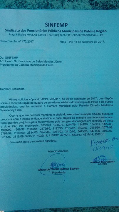 O Sinfemp (Sindicato dos Funcionários Públicos Municipais de Patos e Região) protocolou ofício na manhã de hoje (11/09) na Câmara Municipal de Patos, solicitando cópia do projeto de lei enviado a Câmara pelo prefeito Dinaldo Filho (PSDB), que trata reestruturação do quadro de servidores efetivos do município. O Sinfemp também vai solicitar a realização de uma audiência pública para discutir o projeto de lei. “Simplesmente o prefeito está revogando 32 leis existentes que tratam dos direitos dos servidores públicos municipais, no período de 1973 a 2016, e isso sem nenhuma discussão com o sindicato e servidores”, disse José Gonçalves, vice-presidente do Sinfemp.