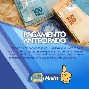 O pagamento dos servidores públicos do município dentro do mês trabalhado tem sido uma prioridade mantida pela gestão do município Malta, em garantia da organização administrativa e financeira do município. “Mesmo com o município recebendo abaixo da meta prevista, a gestão graças a sua organização mantém o pagamento em dia, garantindo o compromisso da folha salarial sem nenhum prejuízo para os servidores”, disse o prefeito.