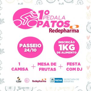 Iniciou nesta segunda-feira (09/10), as inscrições para o 1º Pedala Patos RedePharma, evento que será realizado dia 24 de outubro pela rede de farmácias RedePharma em parceria com a Prefeitura de Patos, através da Secretaria Municipal de Cultura, Turismo e Esporte, juntamente com a STTRANS e o grupo de ciclistas Pedala Batom.