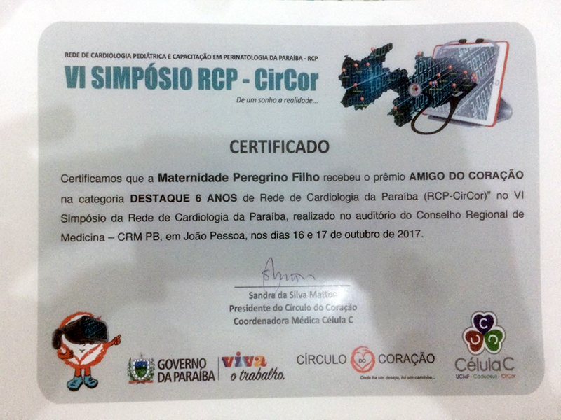 A Maternidade Dr. Peregrino Filho, de Patos, que integra a rede estadual de saúde e a Rede de Cardiologia da Paraíba (RCP) teve, mais uma vez, seu trabalho reconhecido e foi agraciada com o prêmio Amigo do Coração. A pediatra e coordenadora da Rede de Cardiologia Pediátrica em Patos, Dra. Nicoly Negreiros, recebeu o prêmio em nome de sua equipe, durante a realização do VI Simpósio da RCP-CIRCOR, que aconteceu em João Pessoa, nos últimos dias 16 e 17.