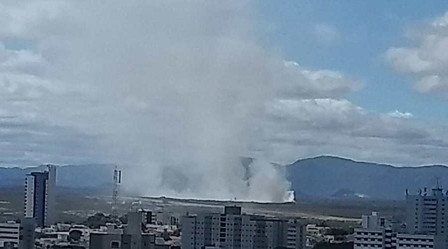 A Prefeitura de Patos também está com suas máquinas no local, mas, apesar dos esforços concentrados, o fogo continua forte neste momento (17:35) e de longe dá para se ver a cortina de fumaça branca.