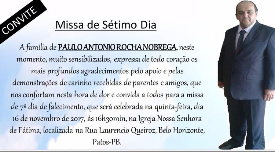 Início Locais Missa de 7° Dia por alma de Paulo Antônio Rocha Nóbrega Missa de 7° Dia por alma de Paulo Antônio Rocha Nóbrega 16/11/2017 ... 09:17h FacebookWhatsAppPrintCopy URL A família convida parentes e amigos para a Missa de 7° Dia por alma de Paulo Antônio Rocha Nóbrega, que será realizada nesta quinta-feira, 15, na Igreja Nossa Senhora de Fátima, em Patos, às 16h30min. LEIA MAISÚltimas notícias Locais Patos é 1º lugar na Paraíba em indicador nacional de Educação Infantil Locais Chuva intensa: Teixeira registra 123,5 mm em menos de 24 horas Locais Audiência pública em Patos aprova por unanimidade a criação do IFSertãoPB
