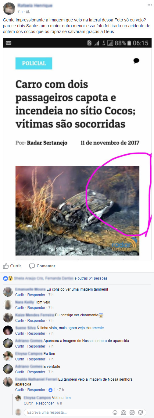 Comentários de internautas na rede social Facebook afirmam haver uma suposta imagem de uma Santa, aparentando ser Nossa Senhora Aparecida, sombreada por fumaça, em uma fotografia feita pelo site Radar Sertanejo, durante um incêndio de um carro que capotou na noite do sábado (11), na rodovia PB-400, entre os municípios de Cajazeiras e São José de Piranhas. No acidente, os dois ocupantes do veículo foram retirados com vida das ferragens por um homem e uma mulher, com o carro já em chamas. As vítimas sofreram queimaduras graves e foram reconduzidas para o Hospital de Trauma de Campina Grande, mas não resistiram e morreram.