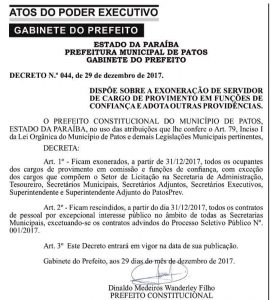 No artigo 1º, o decreto relata: “Ficam exonerados, a partir de 31/12/2017, todos os ocupantes dos cargos de provimento em comissão e funções de confiança, com exceção dos cargos que compõem o Setor de Licitação na Secretaria de Administração, Tesoureiro, Secretários Municipais, Secretários Adjuntos, Secretários Executivos, Superintendente e Superintendente Adjunto do PatosPREV”…