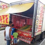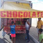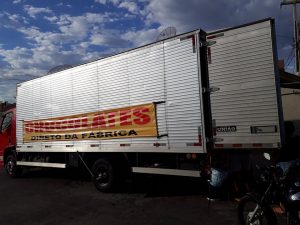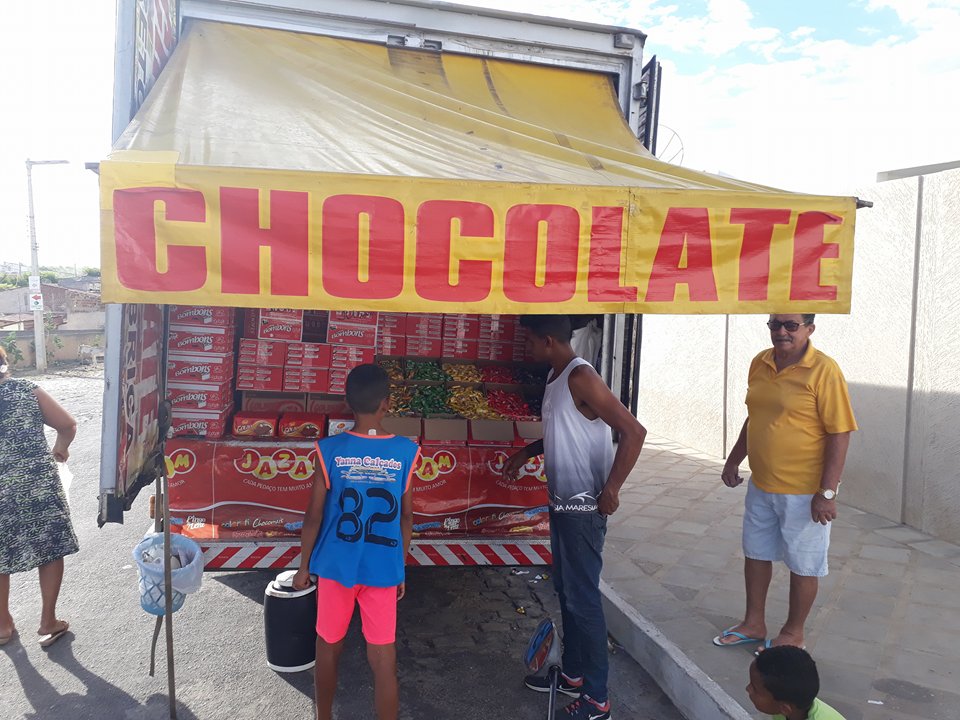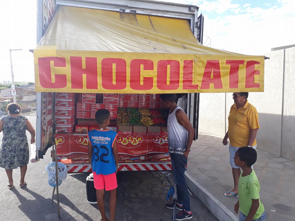 O caminhão veio de São Paulo e vai passando de cidade em cidade e vende chocolates em barra e recheado.