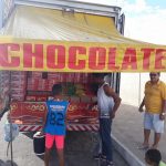Até às 17 horas ele estará lá oferecendo 40 chocolates por 10 reais. “Além dos 40 chocolates o cliente ainda leva mais dez chocolates de brinde, chocolates diretos da fábrica”, diz o vendedor Eduardo Alves.