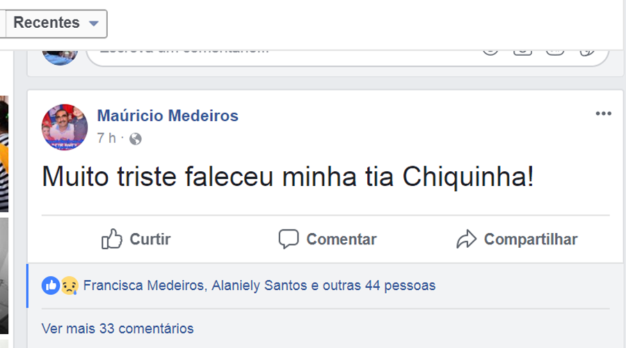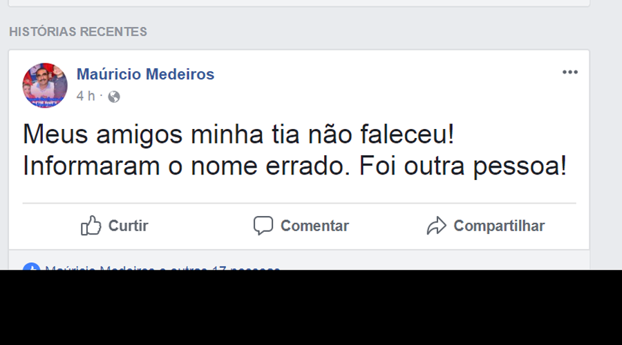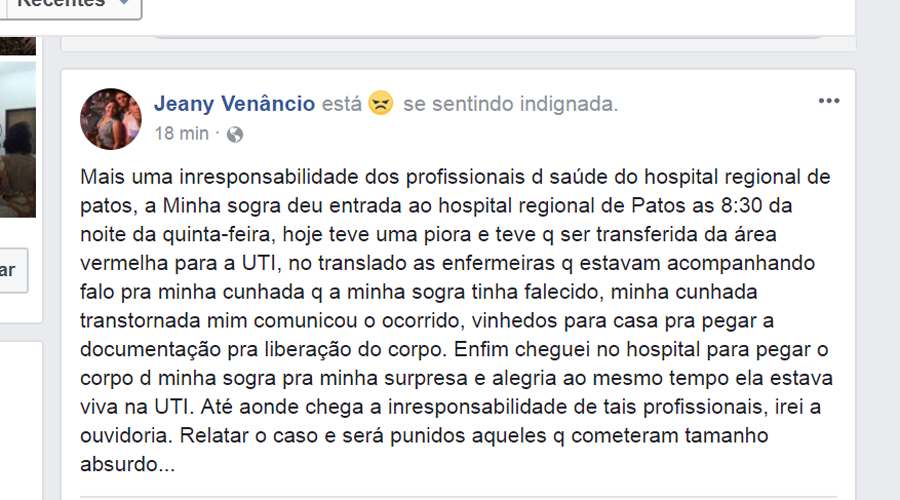 Na manhã desta sexta-feira, por volta das 11h40min, um fato bizarro ocorreu no Hospital Regional de Patos: uma idosa chamada Francisca Araújo de Souza, conhecida por Chiquinha, 78 anos, teve a morte confirmada por engano pelas enfermeiras, enquanto a mesma era transferida da área vermelha para UTI. Chiquinha é sogra de Jeany Venâncio, presidente da Associação Comunitária do Sítio Trincheiras.