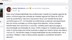“Eu procurei a ouvidoria do Hospital, falei com o rapaz por telefone, pois ele não estava aqui, estava em João Pessoa resolvendo umas coisas. Segunda-feira, 29, irei retornar lá novamente e vou colocar o caso pra frente. Não vou deixar assim de jeito nenhum”, informou Jeany Venâncio ao portal Folha Patoense.