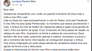 A garrafa passou raspando na cabeça de um adolescente de 13 anos chamado Luan. O adolescente, segundo a vendedora Luciana Pereira, mãe dele, está com um dos lados da cabeça avermelhada, porque a garrafa tocou nele de raspão. “Se tivesse pego de cheio na cabeça dele teria matado”, disse.