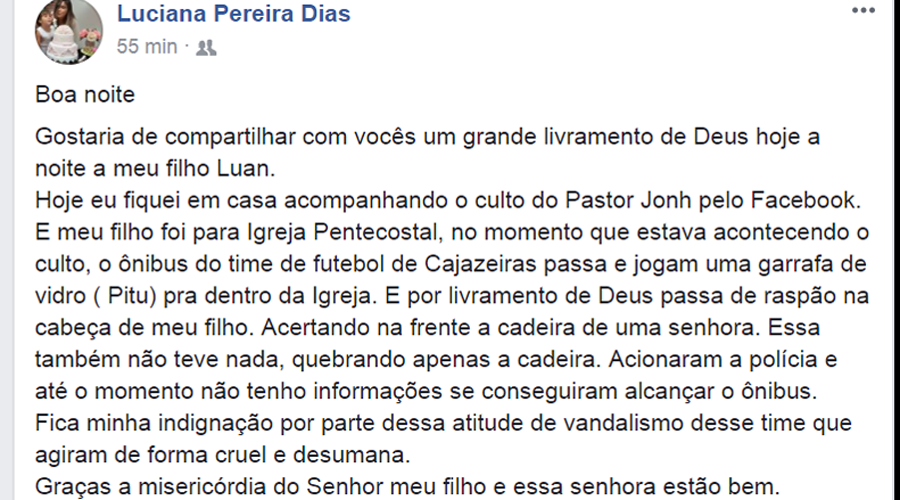 A polícia foi acionada e estava tentando alcançar o ônibus para investigar quem arremessou a garrafa de cachaça dentro da igreja. Até o fechamento desta matéria não tivemos mais informações. “Fica minha indignação por parte dessa atitude de vandalismo. Graças a misericórdia do Senhor meu filho e essa senhora estão bem”, disse a mãe do adolescente Luan.