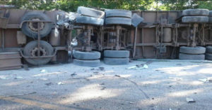 Com a batida, uma das carretas, carregada de adubo, perdeu o controle e colidiu no guard-rail. Após isso, ela bateu em uma segunda carreta, que estava descarregada, e tombou em seguida.