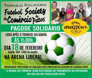 Neste domingo, 18/02, na Arena Liberal, localizada no Jardim Europa, nas proximidades do Canal do Frango, vai acontecer um torneio de futebol envolvendo amigos do professor de Educação Física Raimundo Neto, que em breve vai precisar se submeter a uma cara cirurgia na patela.