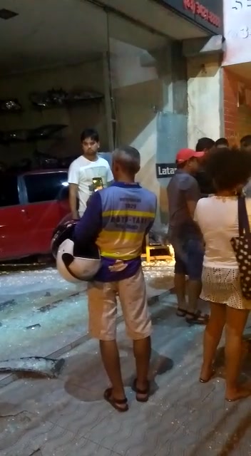 A loja Unividros teve sua fachada parcialmente destruída por um veículo, compatível com modelo Fiat Uno, de cor vermelha.