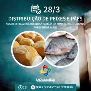 A Prefeitura Municipal de São Mamede através da Secretaria de Assistência Social vai distribuir nesta quarta-feira, 28/3, uma tonelada de peixes incluindo pães a todos os beneficiários do Bolsa Família, tanto os da zona rural quanto da urbana. A entrega será às 16h no Bezerrão.