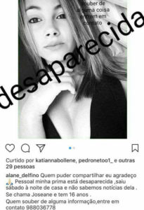 A jovem Joseane Delfino, de 16 anos, desapareceu na noite do último sábado, 31/03, em São Mamede, na região de Patos. “Ela saiu sábado à noite de casa e não sabemos notícias dela”, disse uma prima dela numa rede social.
