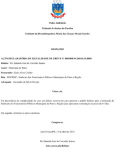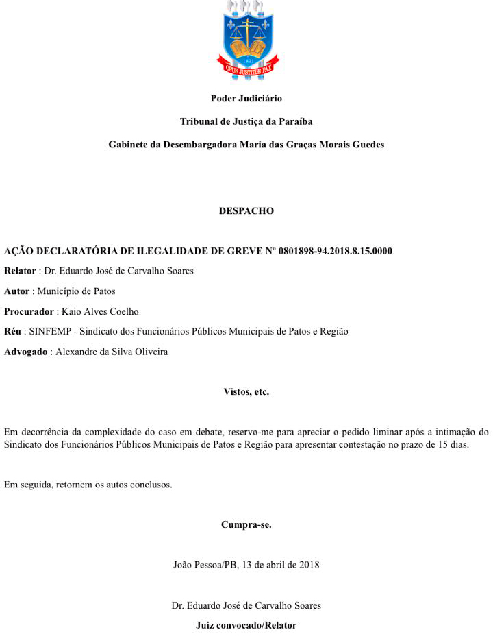 A assessoria jurídica e diretoria do Sinfemp, por intermédio, respectivamente, de Dr Alexandre Oliveira e Maria do Carmo Nunes Soares, informam que o TJPB não analisou o pedido de liminar feito pelo município de Patos para declarar a ilegalidade da greve e autorizar o desconto dos vencimentos dos servidores em greve, sob fundamentação de complexidade da causa e, assim, determinou a citação do Sinfemp para se defender em 15 dias úteis para depois apreciar o pedido de tutela provisória efetuado pelo referido município, conforme despacho proferido no dia 13/04/18.