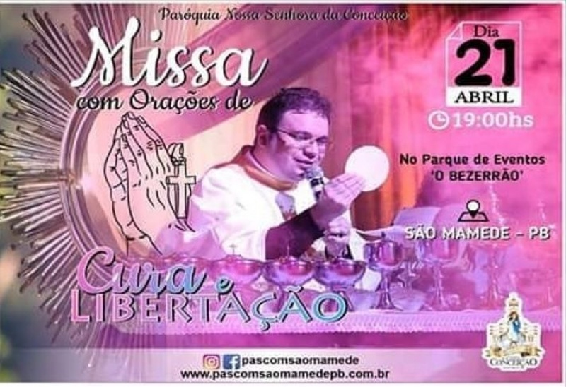 A expectativa é grande entre os fiéis católicos para a missa com orações de cura e libertação que será celebrada neste sábado, 21 de abril, na praça de eventos o Bezerrão, na cidade de São Mamede, às 19 horas.