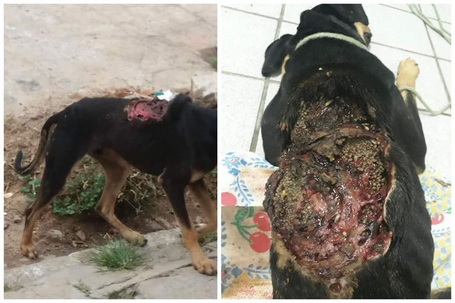 O cachorro foi encontrado com parte do corpo em carne viva, coberto de tapurus, um sofrimento tirano.