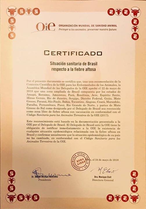 A diretora-geral da OIE, Monique Eloit, entregou o certificado sanitário ao ministro da Agricultura, Pecuária e Abastecimento, Blairo Maggi, na sede da organização em Paris, durante a 7ª Sessão Plenária da instituição. A Comissão Científica da OIE aprovou a certificação do Brasil em 2017, mas os 181 países integrantes da organização oficializam a decisão nesta quinta-feira.