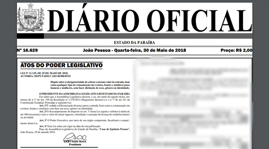 Entrou em vigor nesta quarta-feira (30) a lei que obriga estabelecimentos a cobrar o mesmo valor de entrada para homens e mulheres. A lei foi promulgada pelo presidente da Assembleia Legislativa da Paraíba (ALPB), Gervásio Maia, e publicada no Diário Oficial do Estado (DOE) desta quarta-feira.