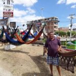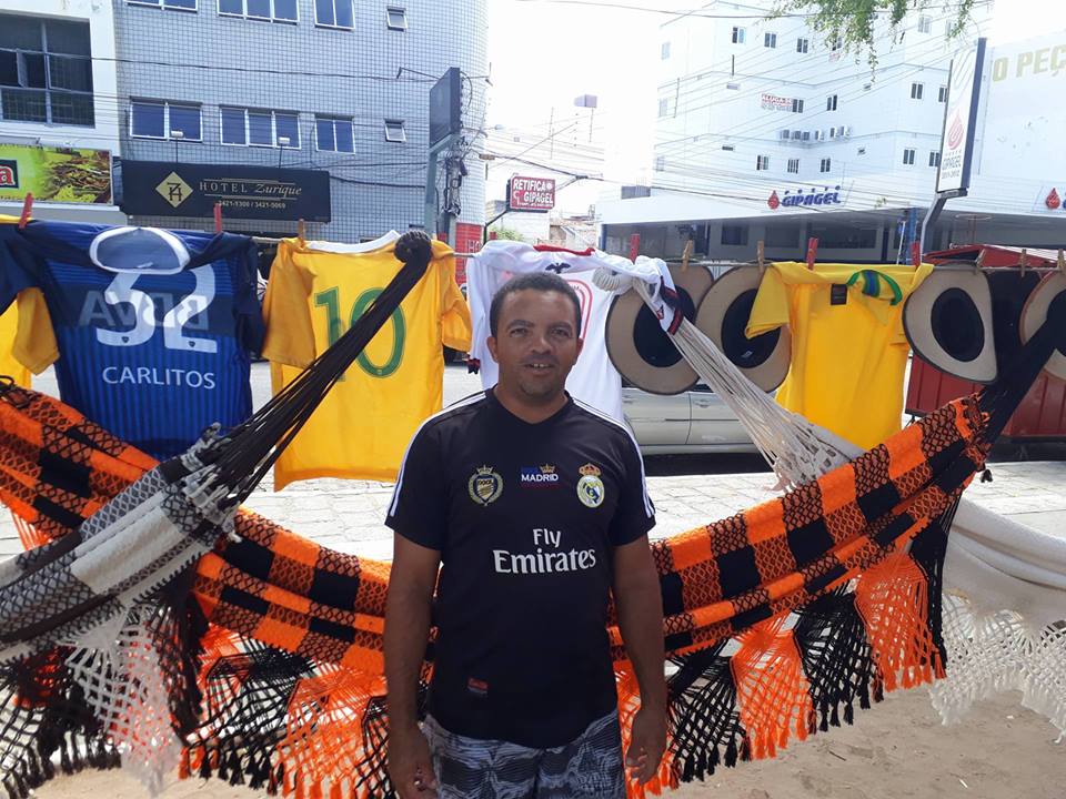 Sandro Nóbrega, vendedor da Praça Getúlio Vargas, chega às 8 horas e sai às 15 horas. Além de redes, ele também vende camisas e chapéus.