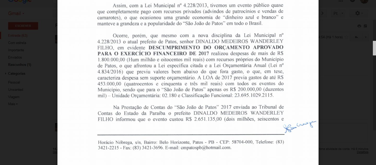 No pedido, a parlamentar autora da denúncia, vereadora Nadir Rodrigues, alega que houve o descumprimento do orçamento aprovado para o exercício financeiro de 2017, com gastos acima do permito por Lei Municipal 4.228/2013 que prevê que o município só poderá gastar até R$ 200 mil com festejos juninos.