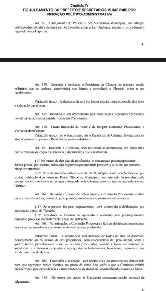 A denúncia diz ainda que assim, o prefeito descumpriu uma Lei municipal cuja punição é passível de cassação de mandato como prevê a Lei Orgânica do Município( art. 82 e 83), bem como a Constituição Federal no seu artigo 37, além do Decreto Lei 201/67.