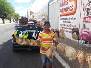 Na Rua Horácio Nóbrega, no Belo Horizonte, ao lado do Estádio Municipal José Cavalcanti, o vendedor patoense Edequias Sefarim Sousa está comercializando uma grande variedade de chapéis, fabricados na cidade de Caicó-RN. “Temos bonés e chapéus de qualidade de todos os tipos, malandrinho, titelinho, Panamá, paete, chapéu de lona e outros, com preço a partir de 15 reais”, disse o vendedor, que pretende ficar no local até o fim do São João de Patos.